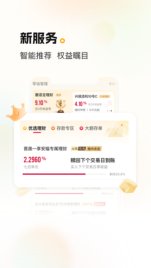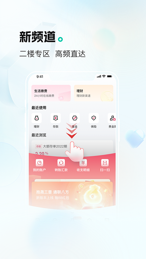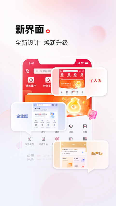 1、服务升级,智能交互 各频道、版面升级,以简约、质感、灵动的设计理念打造全新的视觉风格,同时对百余项功能进行细致打磨,丰富服务矩阵,优化服务分类,精简功能布放,完善客户旅程,全面提升客户操作的流畅性和便捷性。 2、版本模式,自由切换 内设个人版、企业版、商户版三个版本,客户可以根据不同的身份属性在多版本间自由切换,满足多元化服务需求,同时支持设置“长辈模式”,提供清爽体验,强化客户关怀。 3、产品内容,个性推荐 充分利用大数据、人工智能等技术,动态输出适合客户的个性化版面、产品、服务、活动,打造个性化的专属服务体验。 4、安全防护,多重保障 升级交易认证规则,引入智能风控体系,有效识别风险交易,优化扩展人脸识别、视频银行、云证书等移动技术,搭配增强认证体系,全方位保障手机银行安全运营。功能介绍