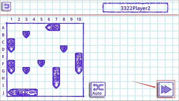 3、然后就进入到了一号玩家的布阵阶段,这里的话,点击Auto按钮可以一键随机布阵,布阵完成后点击右下角的【下一步】图标。