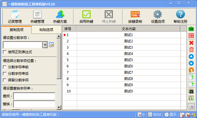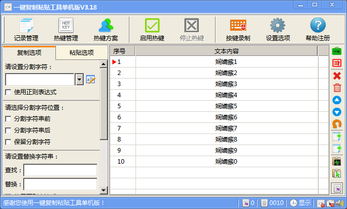 1、可自定义操作热键,并可随时更换,方便灵活。 2、支持可视化界面的操作,让粘贴文本一览无余。 3、支持“连续复制,顺序粘贴/循环粘贴”功能,最大程度减少操作步骤。 4、支持密码文本的复制粘贴操作,轻松登陆软件和网游。 5、支持开机自动运行,自动应用热键功能。 6、支持正则表达式作为分割字符。 7、没有任何功能和时间限制的免费软件。一键复制粘贴工具文本导入乱码怎么办