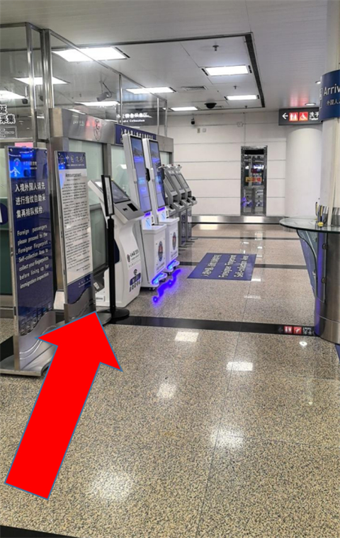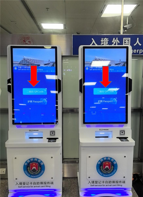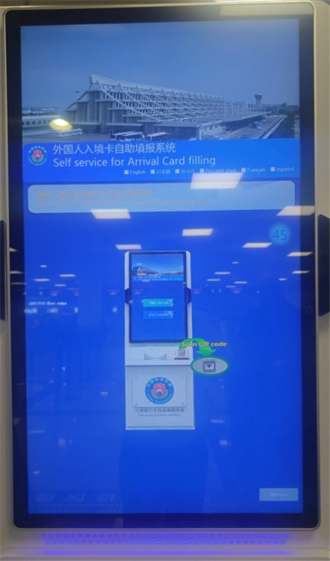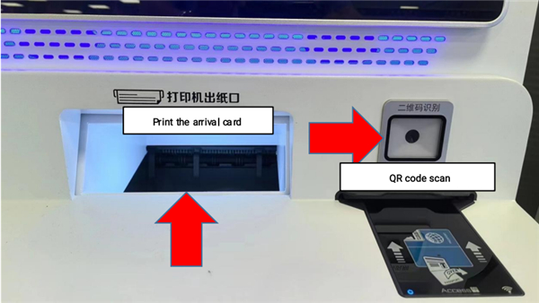 3、按照图示,旅客入境后可前往入境大厅中两台外国人入境卡自助填报终端,将手机内保存的二维码对准扫描窗口,设备自动识别后完成入境卡打印
