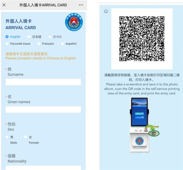 Passengers can choose one of six differentlanguages to fill in the arrival card information.Whencomplete it, submit to get the QR code and should take ascreenshot to save it in the photo album
