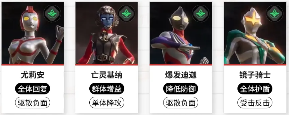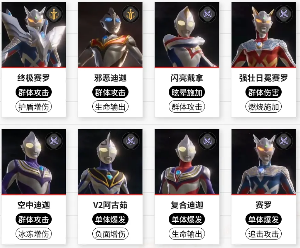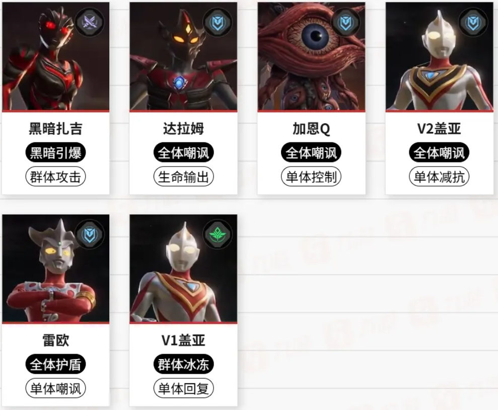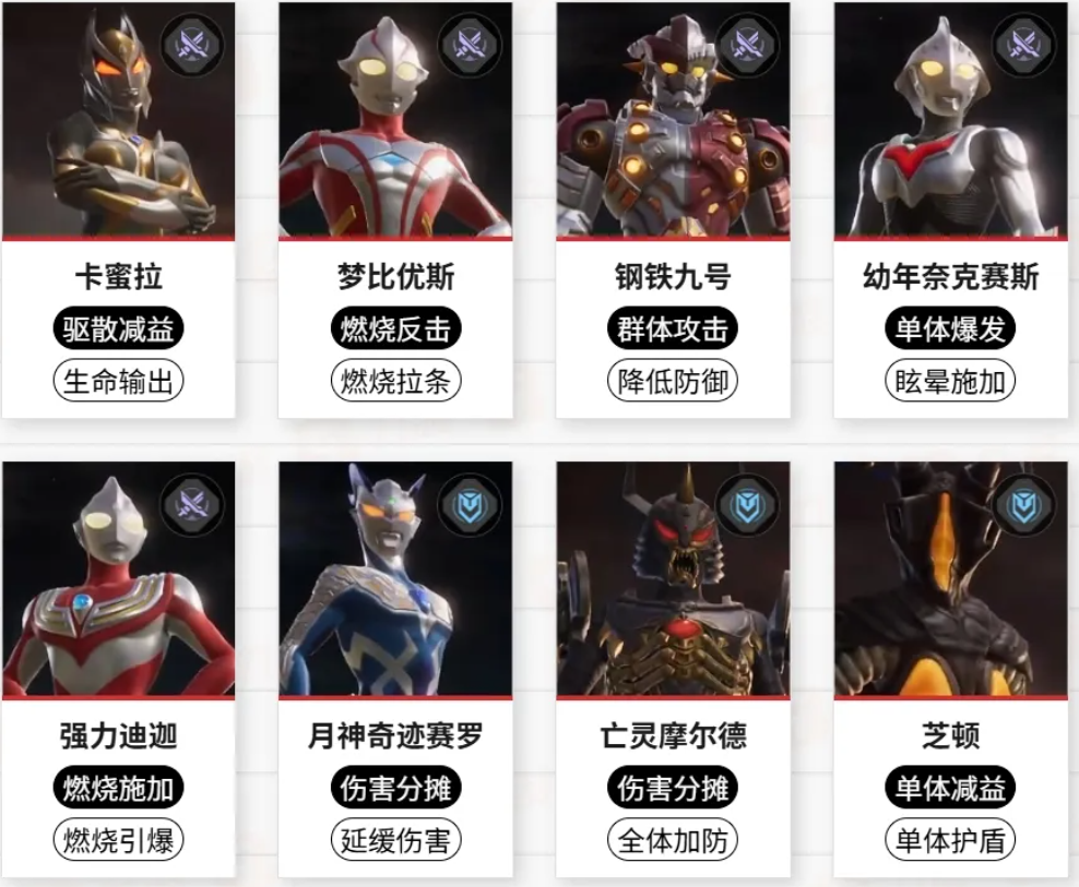 钢铁武士则是通过嘲讽来保护队友,阿古茹V1型可为队伍提供不错的增益加成,还能降低敌人的效果抵抗,方便迪迦强力型挂上燃烧,盖亚V1型则通过治疗和控制,为队伍提供帮助。