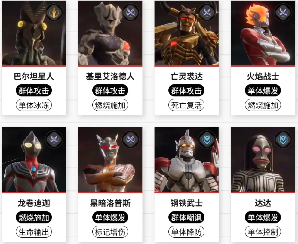 迪迦强力型则可通过引爆燃烧打出高额输出,达拉姆和基里艾洛德人都可群攻,且都能让敌人陷入燃烧状态,为队伍输出创造条件。