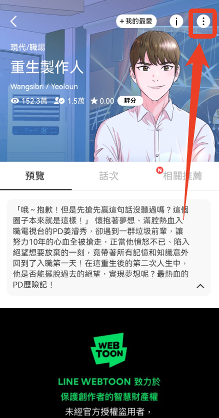 1、进入漫画详情页面后,点击右上方【三个点】。