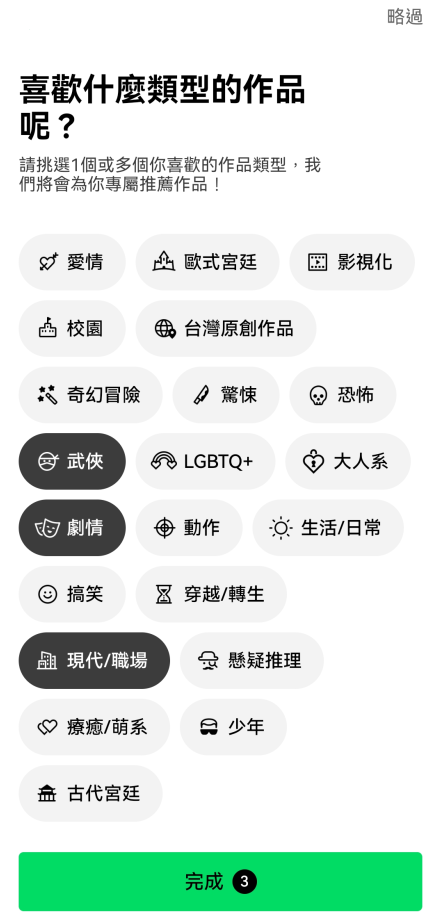 8、选择你喜欢的漫画类型,支持多选,选择完之后点击下方【完成】,也可点击右上角跳过。