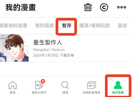 4、下载完毕后,可以在【我的漫画】-【暂存】中查看。