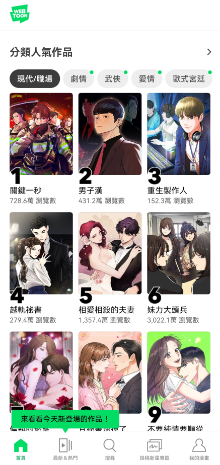 1、免费畅享数百万集剧集! 2、探索全球最大的网络漫画库,涵盖动作、爱情、惊悚等各种题材。 3、现在,您可以通过视频剧集,以前所未有的方式阅读或观看粉丝们喜爱的故事——随时随地,免费畅享! 4、在“最新热门”标签页中,通过个性化推荐和剧集精彩内容,找到您下一部心仪之作。 5、畅享全球热门作品,例如《奥林匹斯传说》、《黑手党保姆》、《全知读者》、《校车墓地》和《再婚皇后》。 6、阅读您耳熟能详的经典作品和图画小说,例如《钢之炼金术师》、《蝙蝠侠:韦恩家族大冒险》、《哥斯拉》、《降世神通:最后的气宗》和《从乡巴佬到剑圣》。 7、汇集《神之塔》、《真美人》、《甜蜜之家》和《嫁给我吧!》等电视和电影改编作品的原创网络漫画,这些作品已在 Netflix、Disney+、Crunchyroll 等平台上线。 8、订阅您喜爱的剧集,并在评论区发表您的意见,与蓬勃发展的漫画爱好者和创作者社区互动! 9、购买金币即可解锁高级内容,例如完整剧集访问权限和抢先剧集访问权限。更新日志