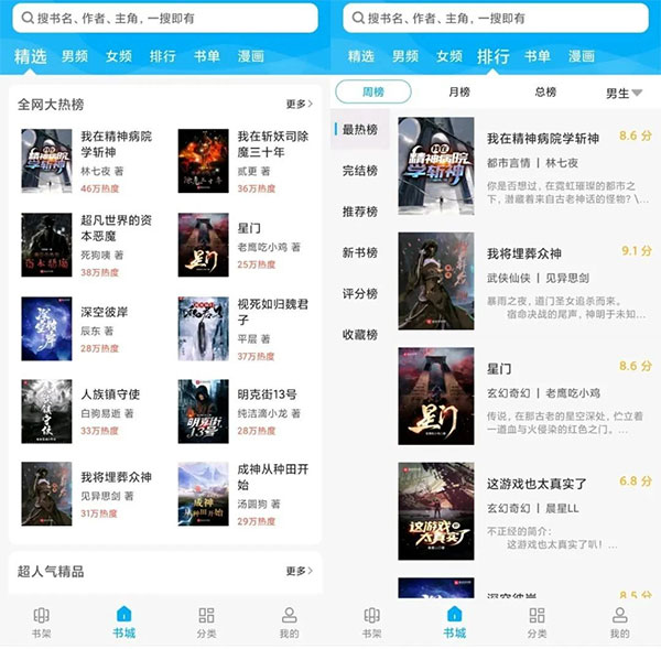 笔趣阁支持小说和漫画两大资源的免费阅读,分为男女不同频道。首页精选了全网大热榜、超人气精品、抖音火热连载、微信都在看、好评如潮、豆瓣优质爽文等全网最热门的小说和漫画资源。