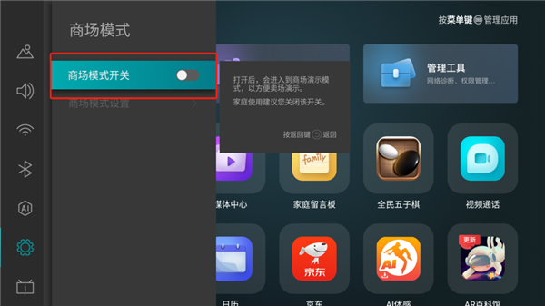 3、在通用设置中,点击商场模式,将状态改为“开启”。若不开启,媒体中心中,将不显示安装包文件。