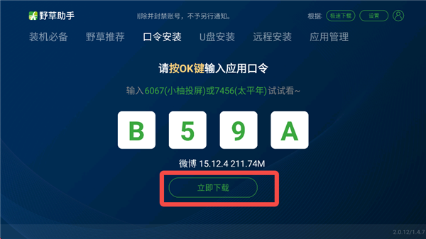6、在电视上打开野草助手,输入口令码,点击【立即下载】。