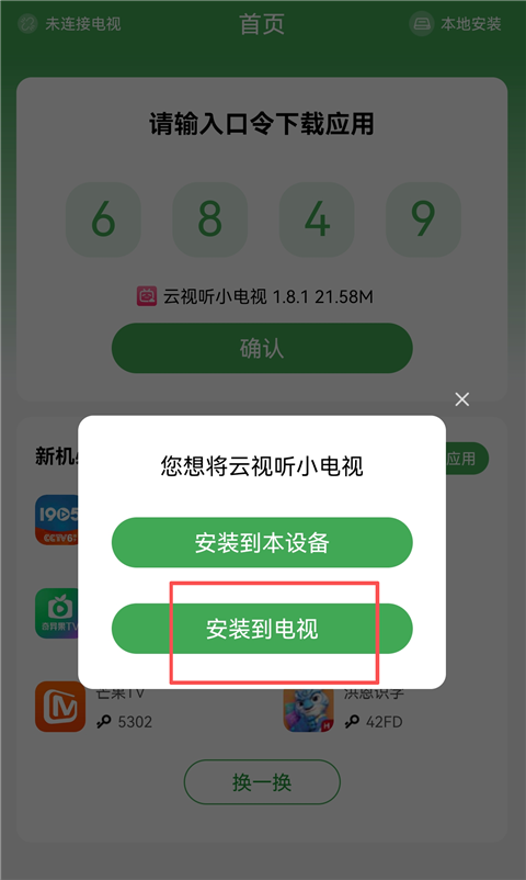 【通过野草助手App】 注意:此方法需要打开手机和电视处于同一WIFI中。 1、点击此处前往下载野草助手App,打开该软件,输入想安装软件的口令码,如6849(云视听小电视),点击【确认】。