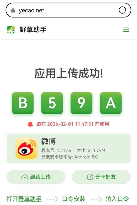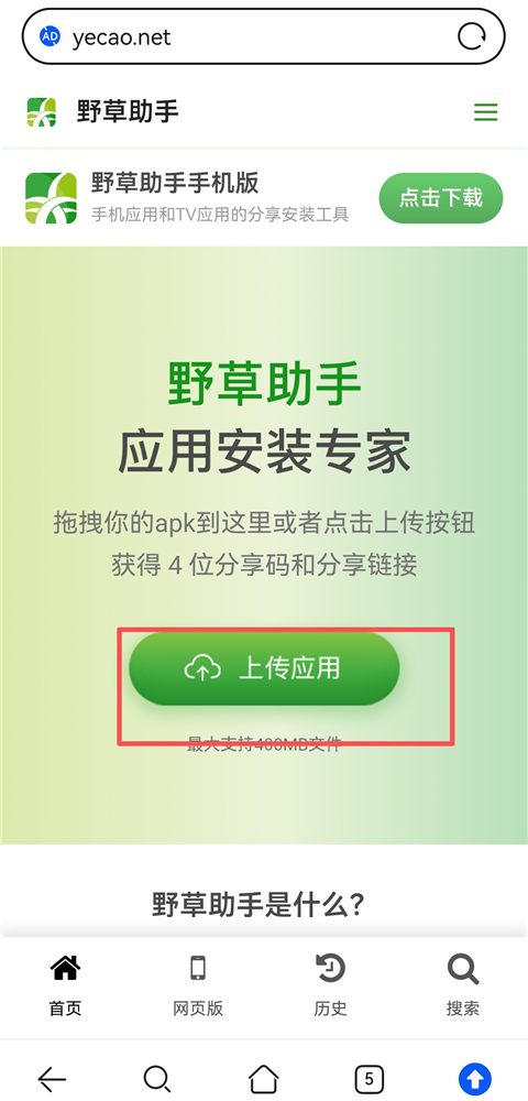3、在手机浏览器中打开【https://www.yecao.net/】,点击【上传应用】。