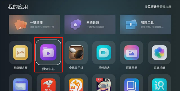 4、回到我的应用中,点击【媒体中心】。