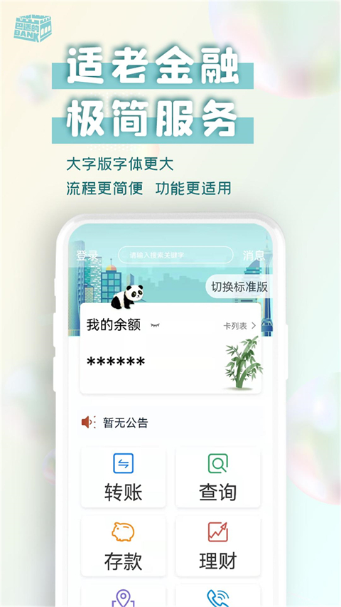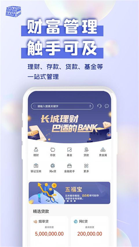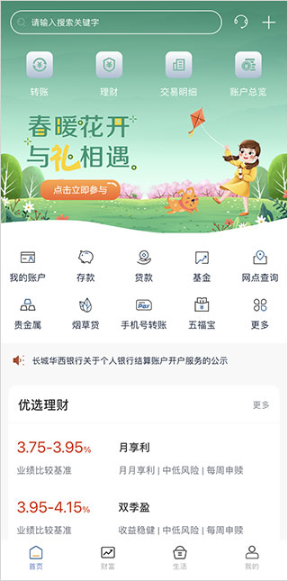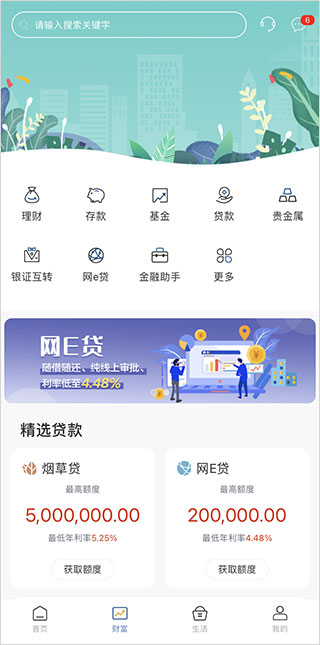 1、进入软件后,用户可在首页进行转账、理财、存款、贷款等操作。