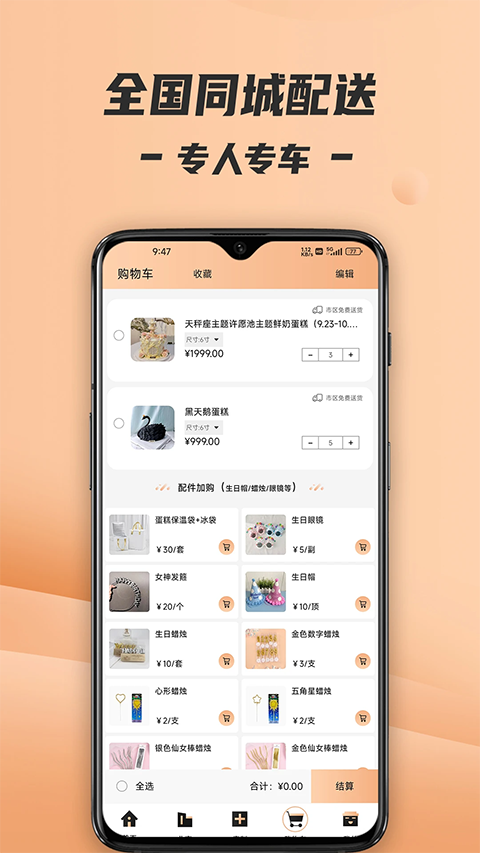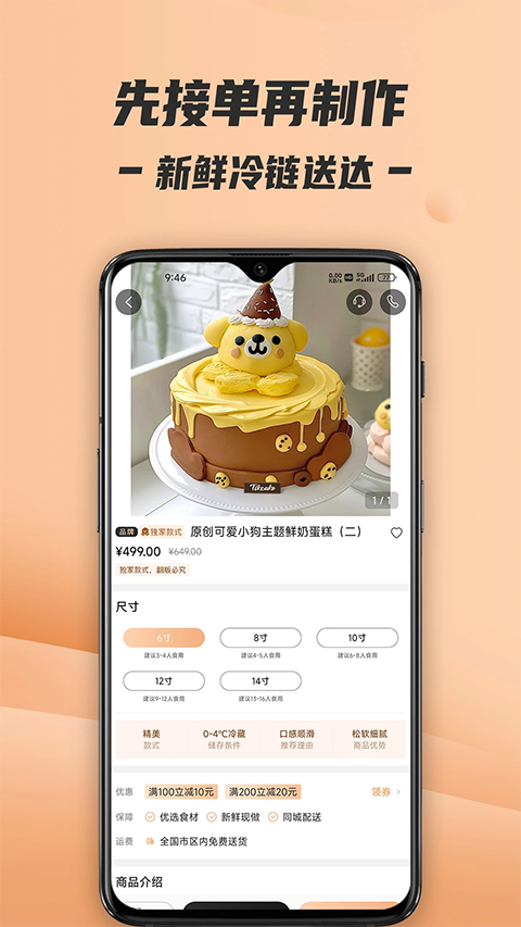1、包含的商品类型多样,品种齐全,涵盖了网红蛋糕、慕斯蛋糕、水果蛋糕等。 2、支持全国范围内进行配送,自动根据收货地址进行就近发货,让你及时收到新鲜的商品。 3、支持个性定制蛋糕,按照需求进行制作,任意咨询客服完成定制。 4、拥有贴心客服,为你提供一对一服务,高效便捷的解决用户遇到的问题。 5、详细介绍了商品信息,包括编号、尺寸、材料、保存方式等,也标注了各食材的含量。 6、提供了超多实用工具,比如有优惠券、收藏、足迹、会员等,丰富用户的使用体验。更新日志