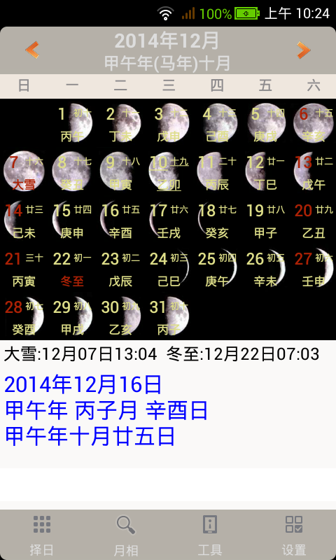 4、如果想看一个月的月相变化,点击“月相”即可。
