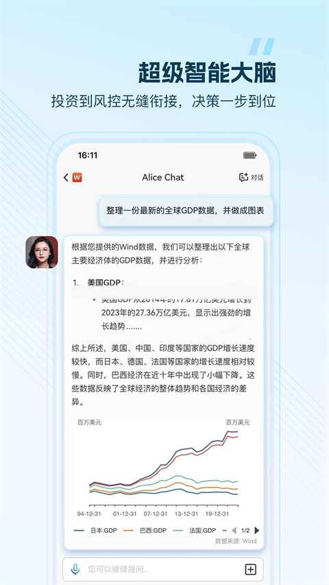 1、Wind金融终端手机版根据市场需求持续迭代近10年,上万人团队始终专注于一款产品,全力以赴打磨精品终端。 2、高速新闻资讯推送,每日原创资讯超过1500条,7*24小时不间断播报国内外重大经济事件,帮助投资者预判行情。 3、拥有全球先进的数据库,宏观数据指标达到500万个,一流的数据质量及质量管控体系已经成为行业标准。 4、囊括全球指数,美亚欧非中东21大指数纵观全球行情,满足各种投资需求,是券商、基金等专业金融机构得心应手的研究工具。 5、海量数据指标,从股票、债券、商品、外汇、基金、宏观、到资产管理、量化投资、风险管理应有尽有。更新日志