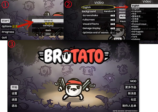 1、中文语言切换 进游戏的第一件事就是调中文,看不懂升级属性标注的话,还谈什么构筑! 界面Options→General→video下第一行English点开选中中文/繁体中文。
