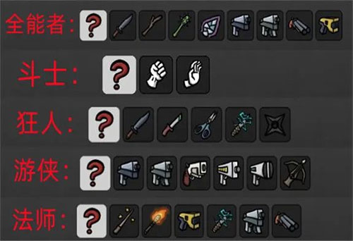 全能者、斗士、狂人、游侠、法师,每个角色都有不同的特性,并且可以在职业所属的武器池中选择一把武器开局。