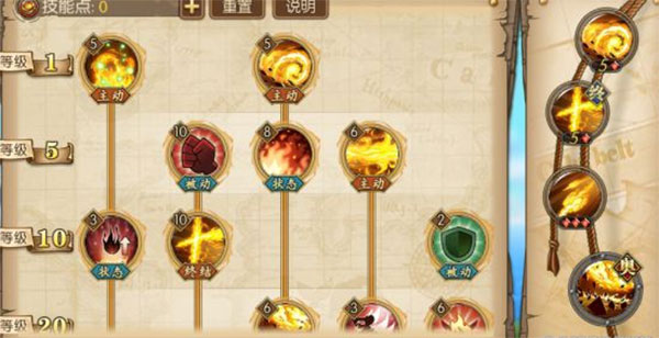 1、艾斯的加点偏向于AOE伤害,火拳和十字火两个最大化艾斯的伤害。艾斯1级技能点火拳;5级技能攻击强化点满,火属性伤害点满;10级技能十字火点满;20级技能奥义点满,火属性强化点满;30级技能十字火的灼烧状态技能点满,炎浪点满。
