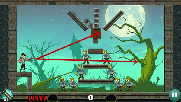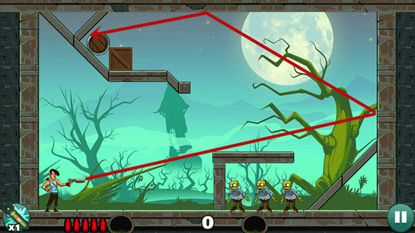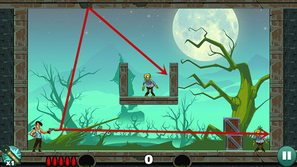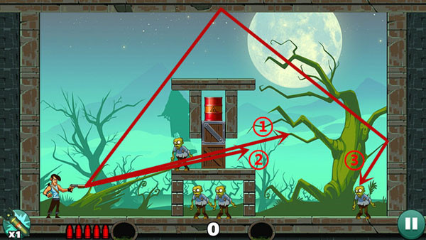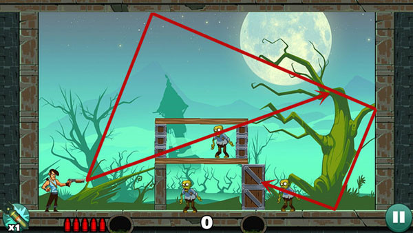 这关比较简单,可以一发子弹打死上面的僵尸,然后用反弹打死右边的僵尸,最后一个直接被木箱子压死。也可以打掉木板从上面反弹下来这样打