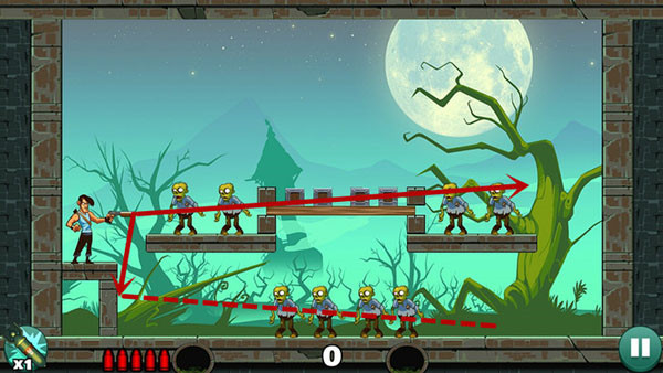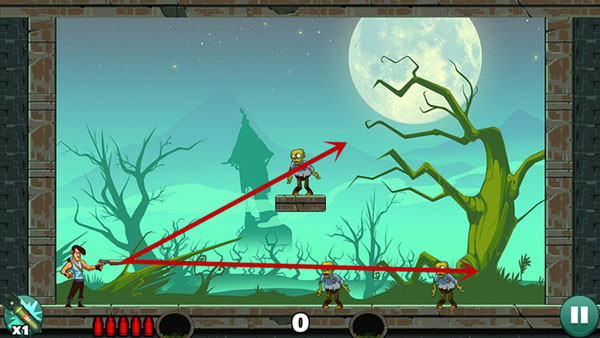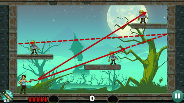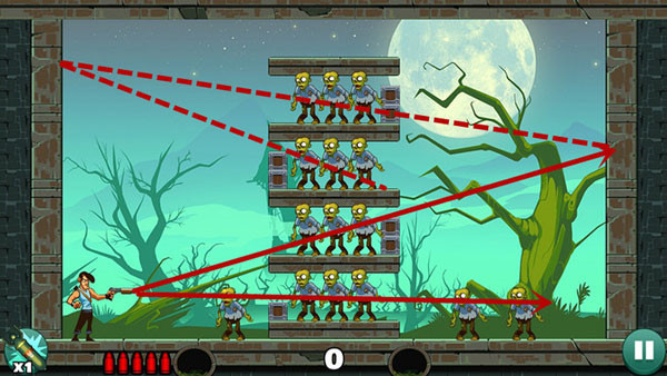 过关的主要技巧就是利用墙壁的反弹和箱子压死僵尸,反弹的位置不好找,这个可以多试几次。在一发子弹没有消失的时候不要打出第二发,万一第一发子弹经过反弹可以杀其他僵尸,这样就造成失误的判断了。如果感觉自己瞄不准可以找个直线的东西比在手机上,这样就可以有个实物的辅助工具了。实在过不去哪一关的情况下可以使用左下角的技能,一个技能轰死所有的僵尸