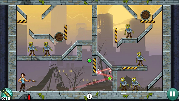1、游戏的画面十分的简单,人物形象有些简易 2、发射子弹,在物理的基础理论下不断反射击杀僵尸 3、每局只有三颗子弹可供发射,三颗之内全部杀完 4、游戏有300个关卡,十分丰富,满足你的需求愚蠢的僵尸攻略
