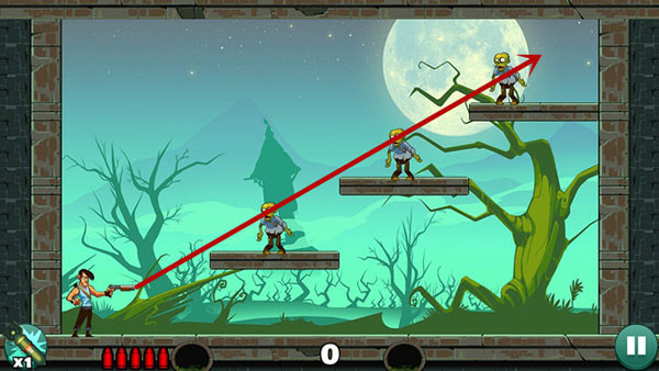 这关比较简单,只要平射一次或两次就可以把下面那个僵尸杀了。上面的僵尸利用反弹杀掉,找不准位置可以多用几发子弹来找