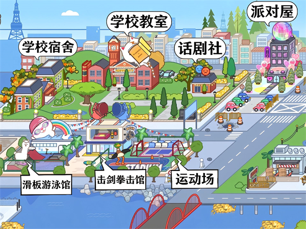 11、学校宿舍、学校教室、派对屋、话剧社、滑板游泳馆、击剑拳击馆、运动场。