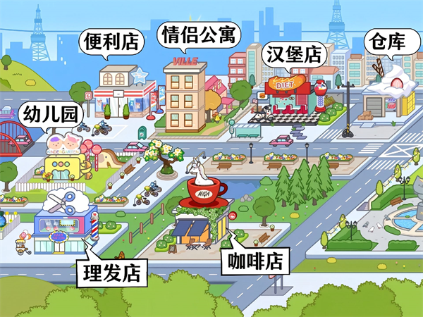 14、幼儿园、理发店、咖啡店、仓库、汉堡店、情侣公寓、便利店。