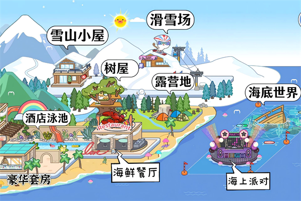 3、雪山小屋、滑雪场、树屋、露营地、酒店泳池、海鲜餐厅、海上派对、海底世界、豪华套房。