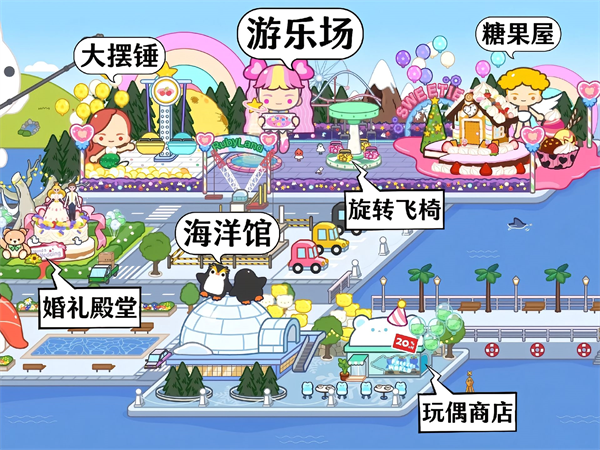 10、大摆锤、游乐场、糖果屋、海洋馆、婚礼殿堂、玩偶商店、旋转飞椅。