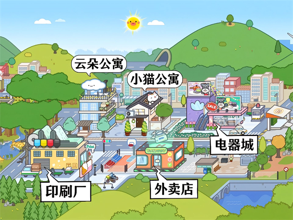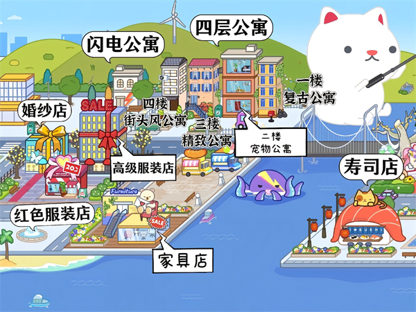 7、云朵公寓、小猫公寓、印刷厂、外卖店、电器城。