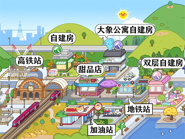 5、自建房、高铁站、甜品店、地铁站、加油站。
