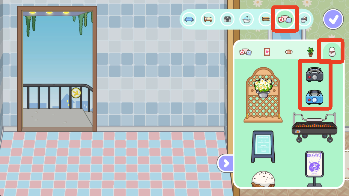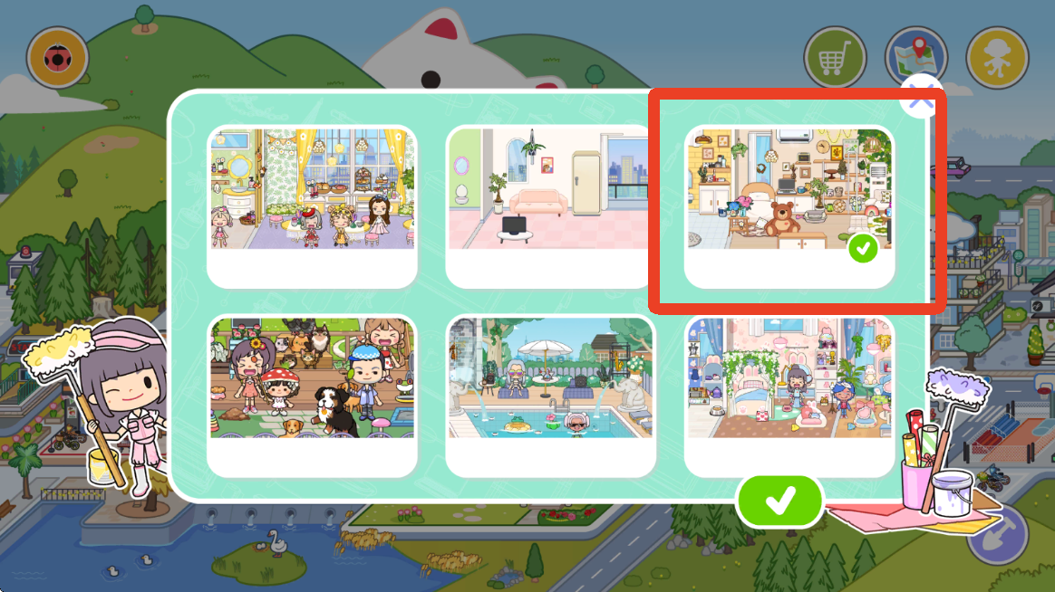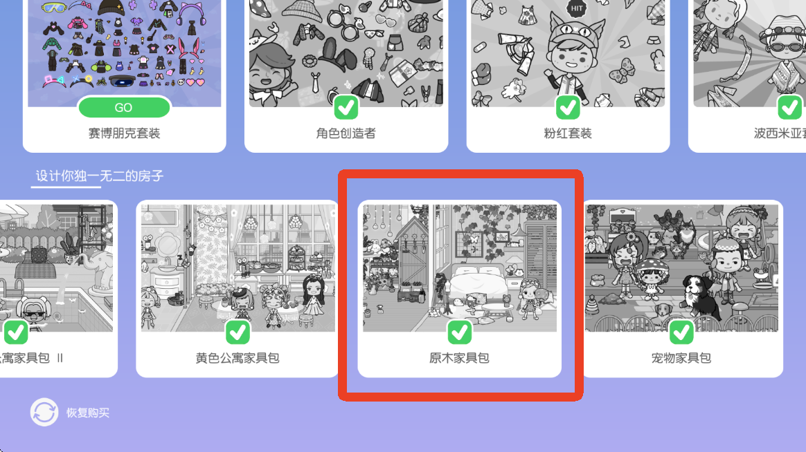3、进入之前我们需要选择这个有小熊的家具包,选择之后点击右下角√进入。