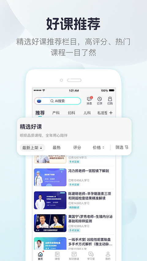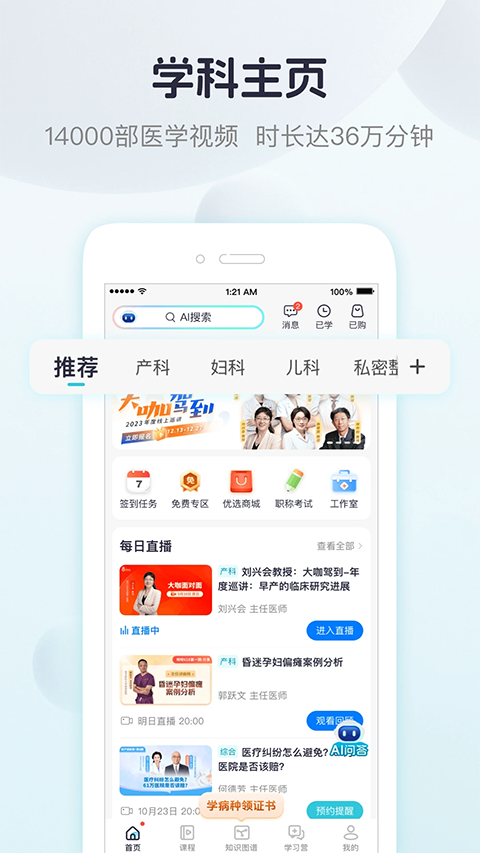 1、【直播课堂】每晚8点大咖在线准时与您相约。 2、【学术会议】足不出户让您享受线下学术盛宴。 3、【创享课程】海量创作者承包您所有学习诉求。 4、【线下实操】小班制手把手教学只为您更专业。 5、【名医在线】三甲名医每天在线为您答疑解惑。软件功能
