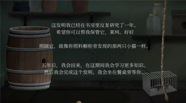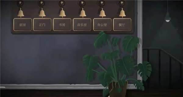 14、向左滑动,来到别墅,进入。玩家一:打开门,下滑下楼,点开酒塞,点击绳子,点击右侧玻璃罐后的壁虎,等它爬到左侧后,再次点击,直到壁虎进入笼子。至此三条信息全部出现。玩家二:花盆下纸条得知,需要按规律敲铃铛才能进入下面的场景。