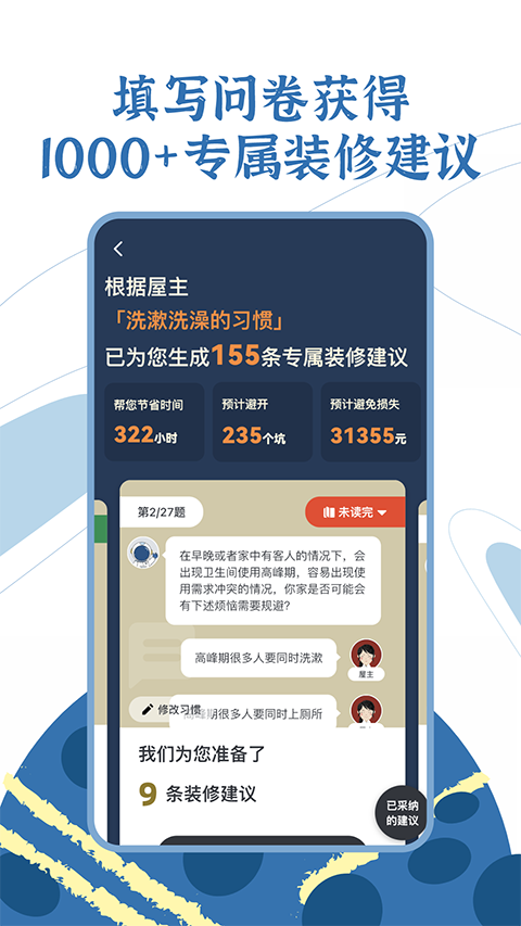 1、全面的装修规划决策 应用提供装修决策问题,收集市面上流行的优秀方案供用户选择,帮助用户在正式装修前仔细斟酌每一个决策,避免施工错误和返工风险。 2、施工图纸与信息管理 用户的每一个决定都以图纸或文字信息的形式整理出来,辅助规范性专业知识,便于用户与施工人员沟通,避免施工过程中信息遗漏。 3、预算下采购商品 将用户的决策转化为商品采购清单,帮助用户在预算下挑选商品,避免预算超支,同时确保商品的质量和合理性。 4、流程化管理施工 应用匹配最适合的施工落地流程,科学管理施工的每个步骤,让施工有条不紊,用户监工更加轻松。应用评测