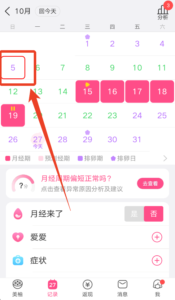 2)点击实际的经期开始日,如图上的5号,将【大姨妈来了】选择为“是”。