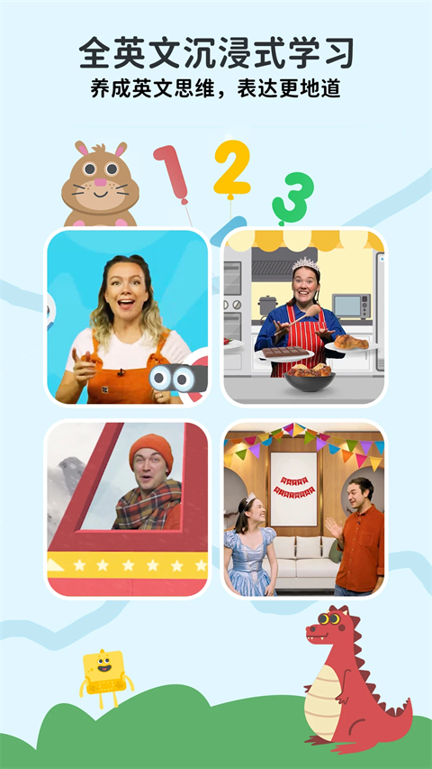 一、教学内容环环相扣,专注引导孩子开口说 - 理解含义:在设计简洁的游戏中,自然理解单词和句子的含义 - 跟读练习:跟老师大声开口读,培养标准地道发音 -开口应用:在问答环节,自由组句、自如对话 二、互动比例高达70%,孩子主动参与,学习更专注 - 200+原创互动游戏:孩子动手动脑动口,快乐玩中学 - 真人剧情互动:跟老师你问我答,自信开口说 三、科学进阶,规律复习,学新不忘旧 - 难度螺旋上升,从单词→词组→句子,拓展学习单词在词组、句型中的变化 - 课程依据艾宾浩斯记忆曲线编排,同个知识点在不同游戏和应用场景中重复出现 四、全英文沉浸式教学,自然养成英语思维 - 课程不含一点中文,让孩子跳过翻译,直接用英文处理信息软件功能