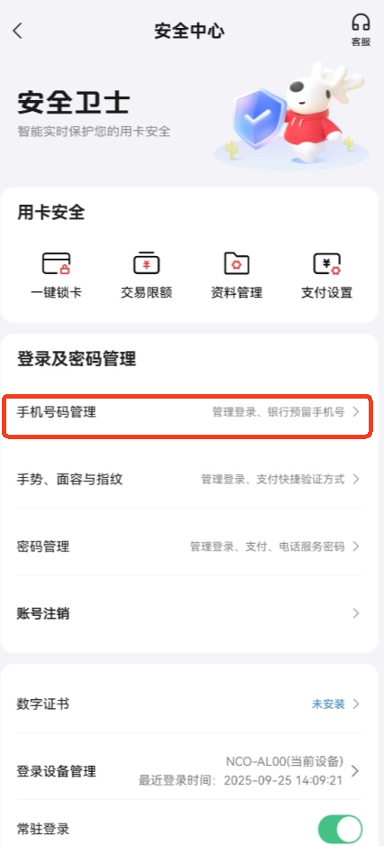 4、进去之后点击手机号码管理,这里面可以管理登录和银行预留的手机号。
