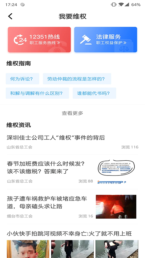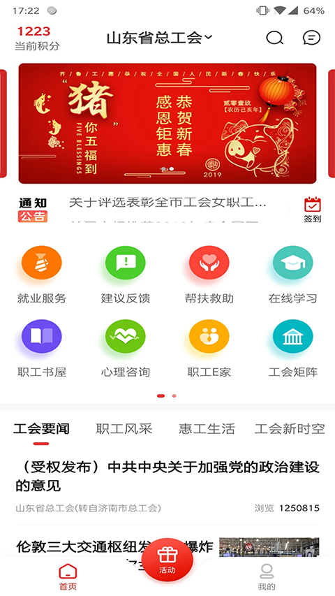 1、着力为全市职工提供普惠性、常态性、精准性服务,将成为工会宣传的新阵地,工作交流的新平台,服务职工的新窗口、联系职工的新渠道。 2、职工点开链接,就能找到工会组织,就能查询到自己需要的政策法规。 3、发一条留言,便能得到专家的专业指导。 4、有一技之长的职工可通过平台来展现自己的能力,实现人生价值。 5、通过参加平台活动,可以得到积分,换取自己心怡的礼物。 6、幸运职工还可以在生日当天收到工会送上的节日蛋糕和生日祝福,在节假日可以抢到免费或低费的电影票等小福利。 7、当职工群众面临劳动纠纷、心理困惑、择业就业、工薪福利、子女婚恋等方面的困难问题时,都能在平台中及时得到方便快捷的帮助和服务等。软件功能