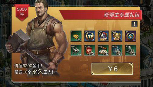 工人礼包包含了10个永久工人,而工人是建筑升级必备的条件,其重要性可想而知。工人越多,建造速度越快,前期的你只有10-20个工人,那么赠送10个工人对升级建造就有很大的帮助了。