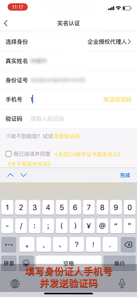 7、填写身份证人手机号并发送验证码。
