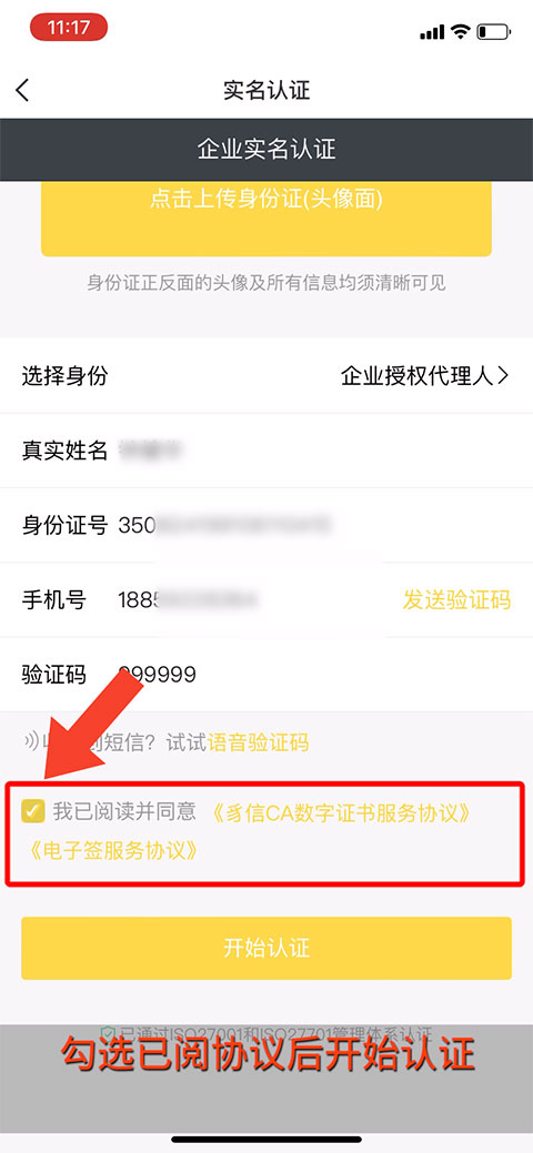 8、勾选已阅勾选已阅协议后开始认证。