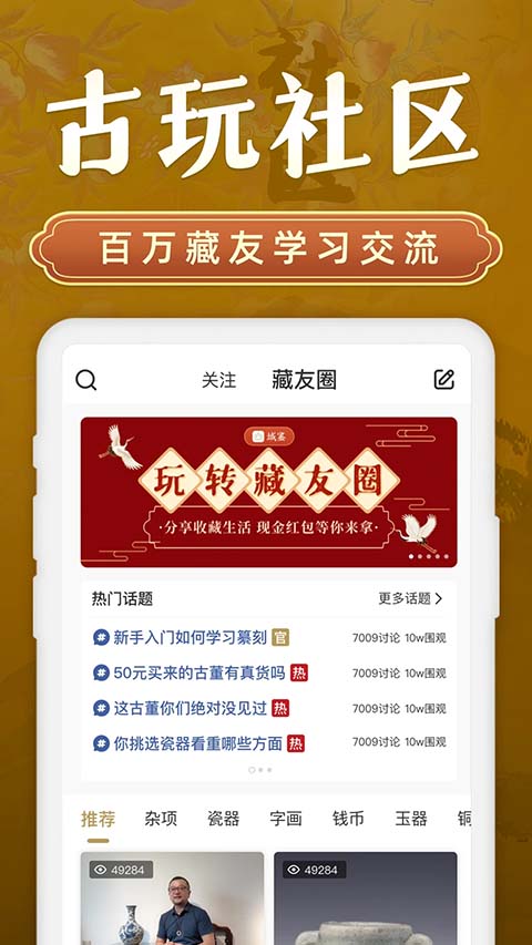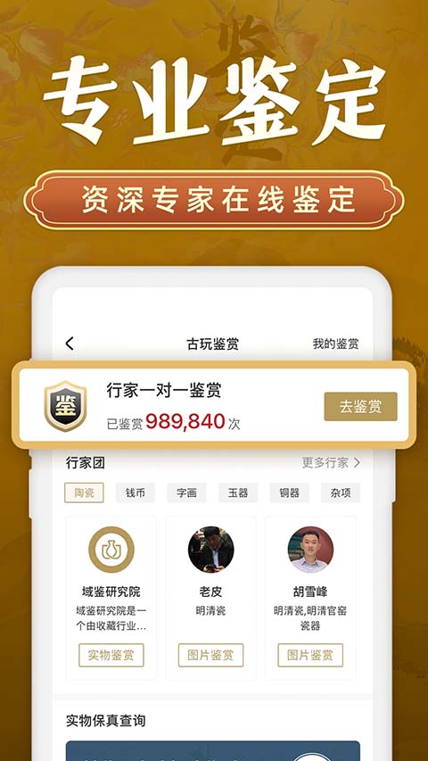 1、捡漏,地摊文化,最新古玩头条应有尽有,域鉴APP最新展开的活动也将会在这里通知给大家。 2、藏友收藏的精品藏品可以联系我们进入优品拍卖。同时藏友的收藏品经域鉴平台的专家鉴定并且鉴定回复为真品后,该藏品可缴纳一定的保证金在平台进行拍卖,藏友也可以竞拍平台拍品,竞拍成功并且付款后,藏品将会被寄送到您的手中,在平台中拍的藏品一律支持7天无理由退货。 3、收藏者可以通过上传图片,选择藏品归类,适当的添加真实描述,然后发送到平台,并由您指定该擅长领域的专家鉴定。想要加速鉴定,也可以选择极速鉴定哦! 4、收藏者的藏品经过平台鉴定为老物件,藏品会自动进入平台藏宝阁,供广大收藏爱好者浏览。在藏宝阁页面,就算你手上没一件藏品,也能大饱眼福更新日志
