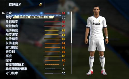 4、技术:传球数值高,射门感觉有点飘,控球盘带灵活程度较好,技能不多不少。