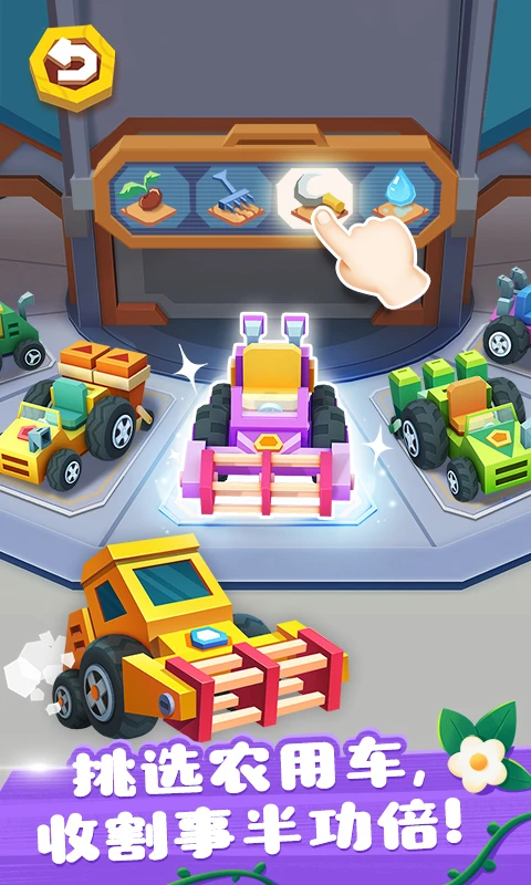 1、开垦农田 ,种植果蔬 先来体验种植!咦,还有些土地尚未开垦?宝宝们快坐上耕地农用车,开始开垦耕地:突突突!驾驶农用车,翻松土地、刨去杂草和石块,土地焕然一新,可以开始耕种咯。 宝宝想先种植哪种农作物?香蕉、苹果、茄子、草莓……可以种植的种类可真多!宝宝们挑选种子、用播种车撒种,再更换洒水车,给种子浇浇水,一起观察它们的成长过程吧。 2、及时喂食 ,饲养动物 农场里饲养着鸡、兔、鱼、牛、羊等近十种动物,宝宝想要照顾好它们,还需要了解它们的生活习性!一起来学一学:小鸡喜欢吃谷粒、兔子爱吃胡萝卜……宝宝们记住了吗? 瞧,小鸡们有些饿了,快带它们“开饭”:拿起挂着羽毛的竹竿,走到小鸡周围,用羽毛带领它们,走到谷粒食槽边……叽叽叽!小鸡吃得真开心,接下来再去喂一喂兔子吧。宝宝巴士奇妙小镇农场种植教程