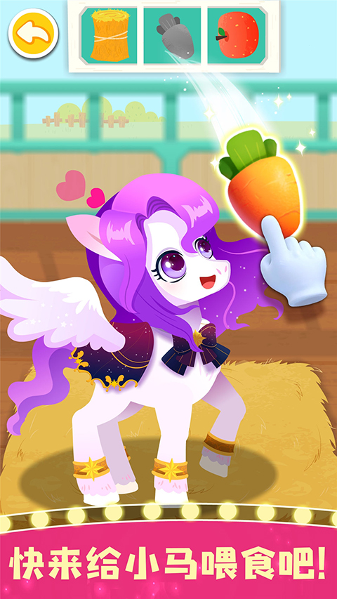 1、蔬果搭配,营养均衡 备赛的小马都吃什么呢?小麦饼干、青草蛋糕,远远不够哦。再去选购一些蔬菜水果吧:玉米、胡萝卜、苹果……营养丰富的食物搭配,才能让小马更强壮! 2、做个清洁护理 小马脏兮兮的,快为它洗个澡!先拿刷子,刷下树叶和尘土。浴花、沐浴露准备好,涂满泡泡,轻轻搓洗,再用花洒冲干净。别忘记用吹风机,吹干毛发上的水渍。 3、赛前问题检查 嗯……小马的马蹄不舒服,快帮它检查一下吧。先安装支架,将马蹄轻轻放上去,修剪指甲、找出裂痕、抹上草药、再上一层保护油……太好了!小马又恢复活力满满的状态啦! 4、赛场技艺大比拼 小马们上赛场啦!四大主题锦标赛:障碍赛跑、高空射击、彩蛋迷宫、舞蹈大赛,让小马大展身手。飞行测试开始。迅速左右滑动,才能过关!猜猜看,如何在射击赛中夺得冠军呢?奇妙小马俱乐部游戏怎么玩