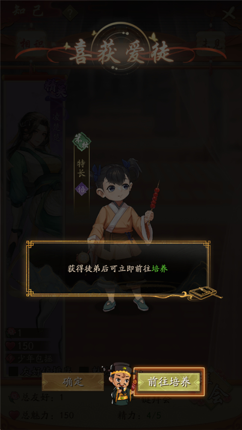 通过拜会/观赏/出游获得知己经验,概率获得徒弟。